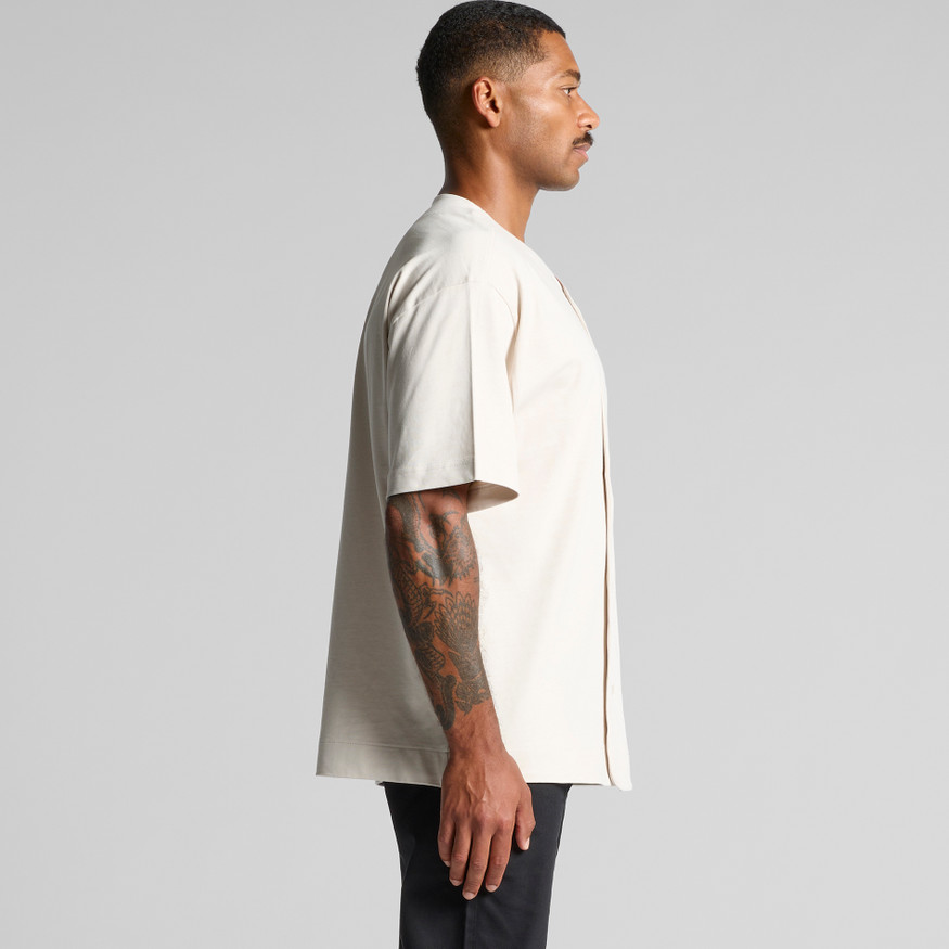 Button up dropped shoulder jersey, wide placket, tonal corozo nut buttons, side seamed, preshrunk to minimise shrinkage